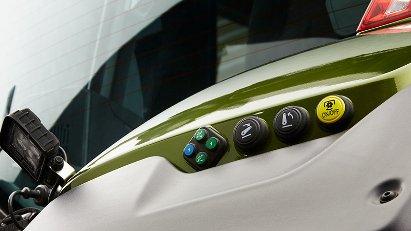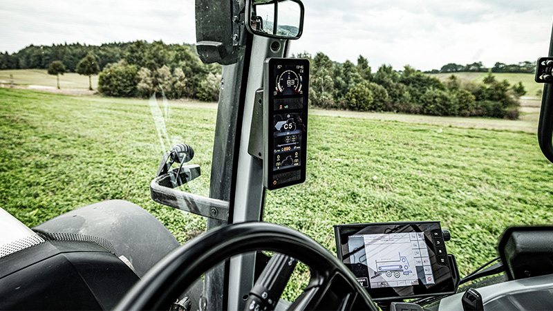 The large A-Pilar console is located at eye level and within easy reach to improve the safety and convenience of the driver. The clear display shows all the tractor information the operator needs when working. Key information is easily and instinctively controlled, by a simple rotating encoder and two buttons. On the road, the A-Pillar display automatically dims non-essential information so the driver can concentrate on the road.